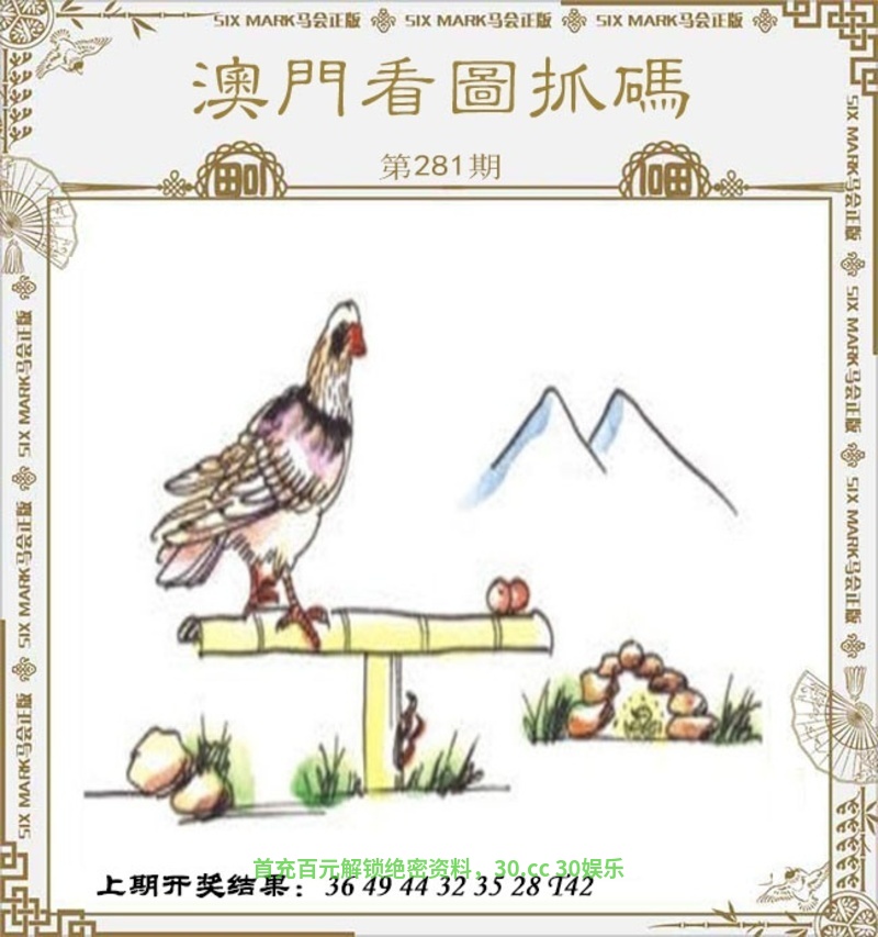 【妙解看图抓码】281期:图中有一只鸟站在一个竹竿上,竹竿的另一端有两个蛋,背景是两座山和一些岩石。
