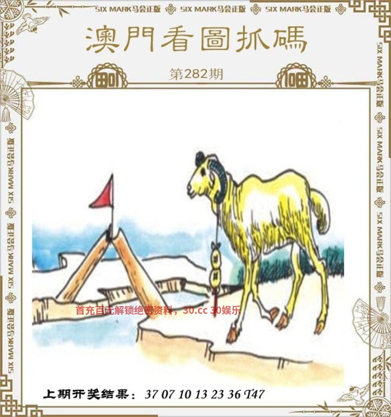 【妙解看图抓码】282期:图中有一只羊正在行走,它脖子上挂着一串铜钱,图中还有一个红旗。